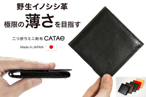 日本の野生イノシシ革で作った縦横約90mm厚さ14mmの二つ折りミニ財布です。極限の薄さと小ささを実現した財布です。特許構造「シェアポケット』でカードと小銭の...