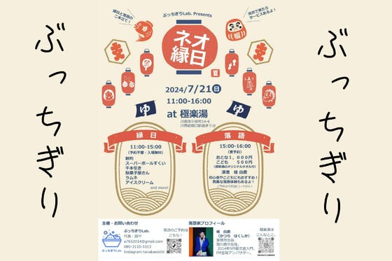 7月21日(日)に川西市唯一の銭湯である『極楽湯』で落語と縁日のイベント『ネオ縁日』を開催します。このイベントを通して、こどもからおとなまで安心して集えるヘンテ...