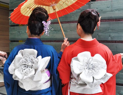 京都西陣織の元職人で現在美容着付け担当しています。着付で一番困った事は 大きい体形のお嬢様が帯の長さが足りず 自前の帯でお花を製作。桜をイメージしたつけ華帯、「...