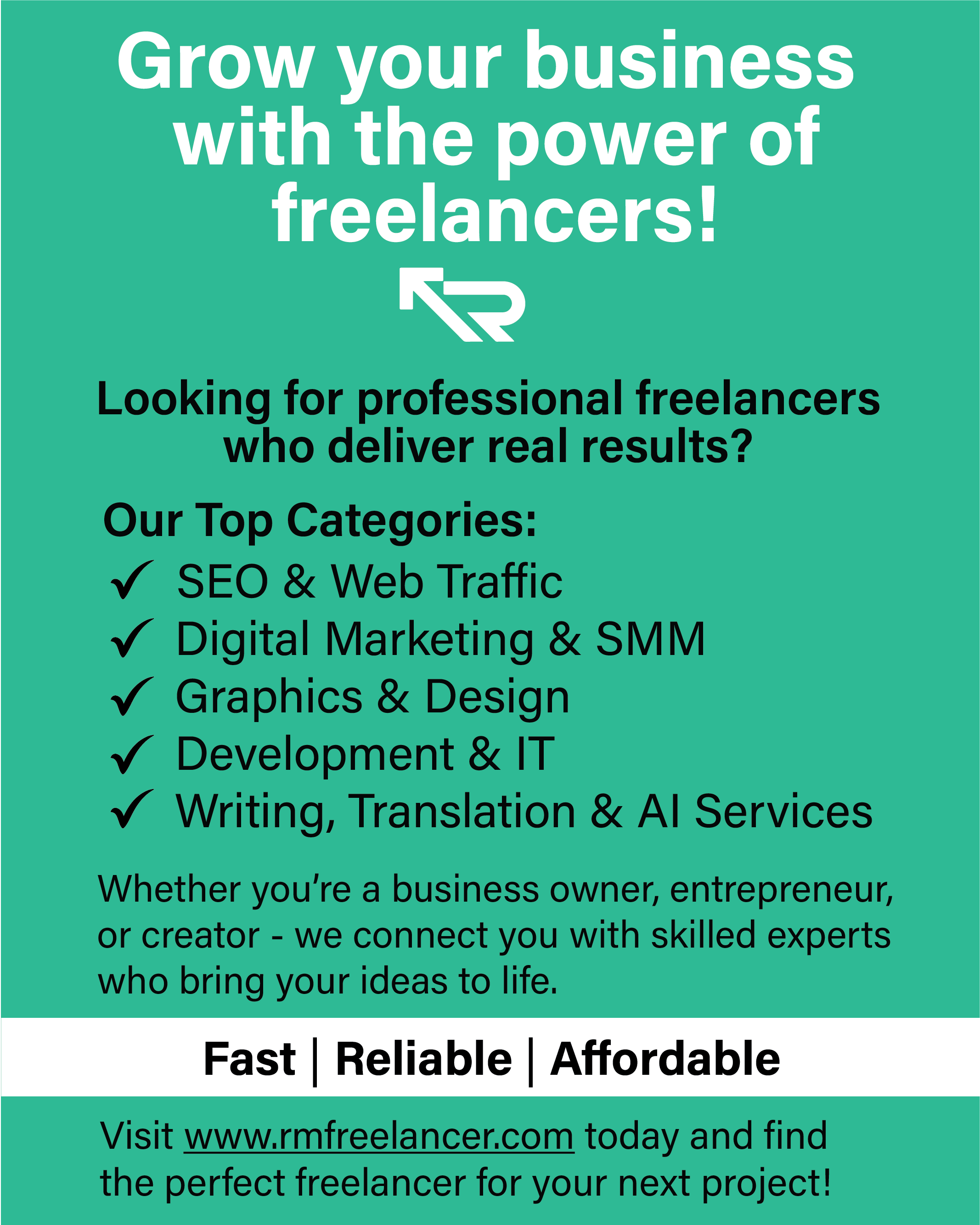 services in SEO, digital marketing, web traffic, art and design, development and IT, writing and translations, audio and video, business and lifestyle, and AI services Connect with skilled freelancers and find the perfect solution for your business needsRMFreelancer is your go to freelance marketplace for top notch