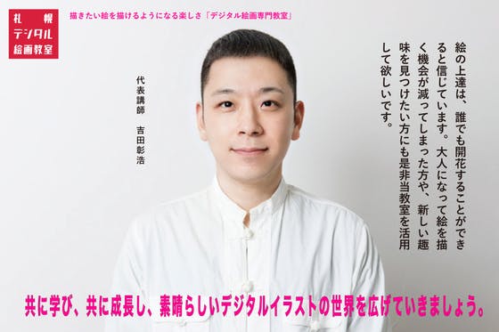 札幌デジタル絵画教室 代表講師:吉田彰浩 所在地:〒065-0016 北海道札幌市東区北16条東10-2-8 ブランノワールN16 403 札幌デジタル絵画教室は、子供も大人も誰でも楽しく学べて、人生の可能性や選択肢を広げることができるデジタルイラストに特化した専門教室です。オンラインでの受講も実地しています。各生徒のニーズに応じたカスタマイズされた指導と最新技術の習得を重視し、学びの場を整えています。 プロジェクト全体を通じて、皆さまの期待に応えられる教室作りに努めてまいります。どうぞご期待ください。