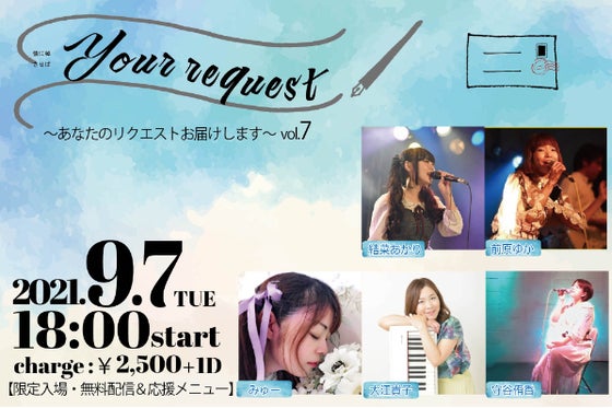 9月7日(火)開催のライブ「ユアリクエスト Vol.7」出演アーティストへのリクエスト曲を募集いたします!会場で観覧の方も、配信をおうちで鑑賞の方も「あの曲聴き...