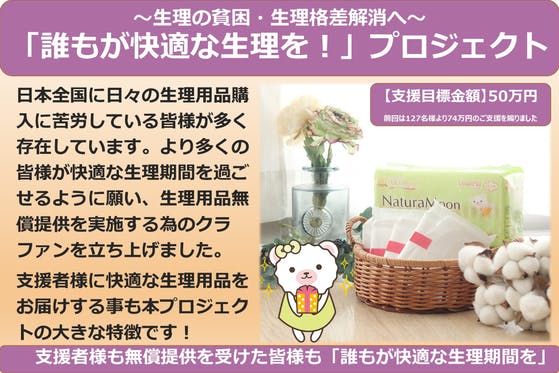 生理用品の購入に苦労している皆様へノンポリマー生理用品の無償提供を実施致します。支援者のリターン品としてノンポリマー生理用品をお届けする(コースによりリターン品...
