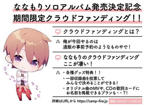ななもり。のソロアルバム発売決定を記念した、様々な特典のついた限定クラウドファンディングです!