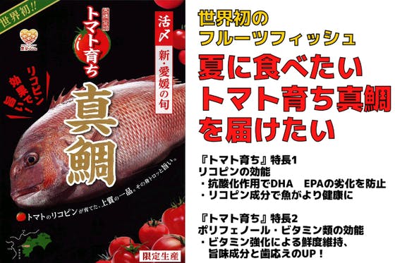 リコピンやカロテン、ビタミン類などトマトを飼料に配合した世界初のフルーツフィッシュ『トマト育ち真鯛』 まだまだ認知度は低いのでこの夏に多くの人に食べて頂き、この...