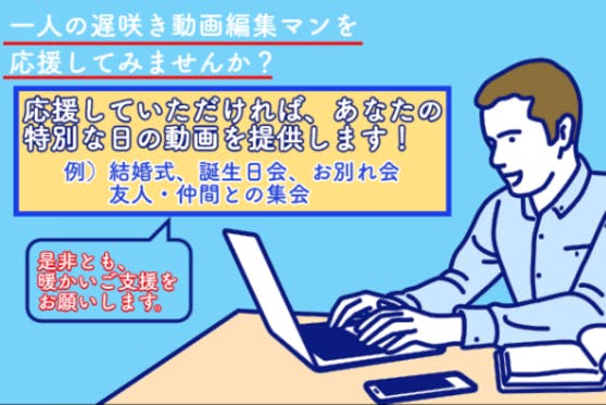 1人の遅咲きの動画編集者を応援してみませんか?応援していただいた方には、結婚式・誕生日会・友人や仲間との集まり・お別れ会等の特別な日に流す動画を提供させていただ...