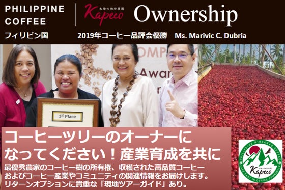 フィリピンコーヒー豆品評会で優勝、上位入賞のミンダナオ産アラビカ種【KAPECO~太陽の珈琲農園~】のコーヒー樹木を1本から所有できます。また、プロジェクトで集...