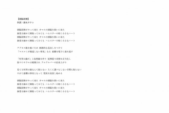 まず金が無い。貧乏だからミュージシャンに依頼出来ない。次にコネも無い。唯でさえ友達いないのに。でも世に出したい歌詞がある。そして何故か世の中に受ける自信がある。...
