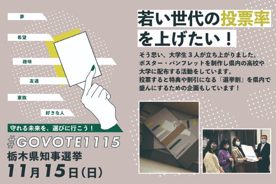 栃木県内在住大学生が「栃木県知事選挙の若者(10代・20代)の投票率を50%にする」を目標に、ポスター・パンフレットを県内の高校と大学に配布しています。また栃木...