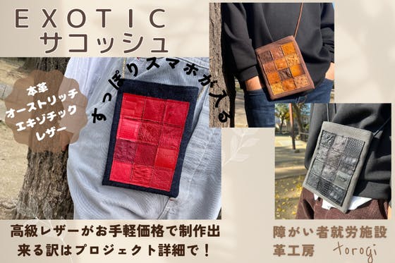 障がい者施設に革工房からの応援で続々と集まった本革の端材。クロコダイル・オーストリッチ・パイソンの高級革で作られたサコッシュはスマフォがサッと出し入れできます。...