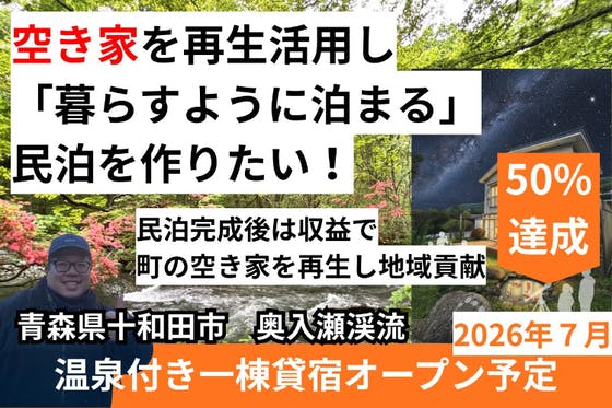青森県十和田市の空き家を再生活用し、温泉付き貸切宿を2026年7月にオープンします。 【暮らすように泊まる】ことで町の魅力を伝え、「楽しい」+「経験・知識」=「...