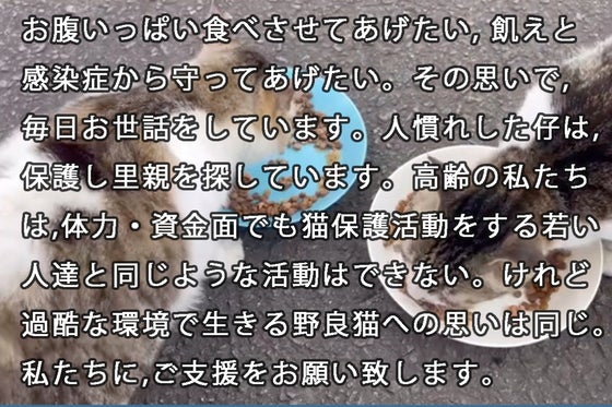 飢えと感染症から守ってあげたい。その思いで活動しています。高齢の私たちは体力的にも資金面にも猫保護活動をする若い人たちと同じような活動はできないかも知れない。け...
