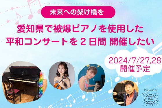 広島から被爆ピアノを迎えて、2024年7/27(土)、28(日)平和コンサートを開催します。 名古屋市の2箇所で広く開催して、小学生から大人まで音楽を楽しみなが...