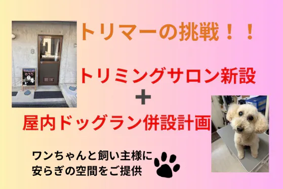 動物愛護管理法の改正により、私のトリミングサロンは環境面で限界に直面している為、サロンを新しくしたいと計画してます。また、新事業、屋内ドッグランを併設予定です。