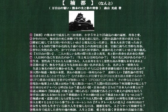 熊本市が舞台、青春・恋愛小説『楠都』各巻、約五百頁、全六巻を出版。青少年・壮年・高齢者の全てに読んで戴きたい。英語へ翻訳・漫画化、映像化予定。小説の主題:熊本市...