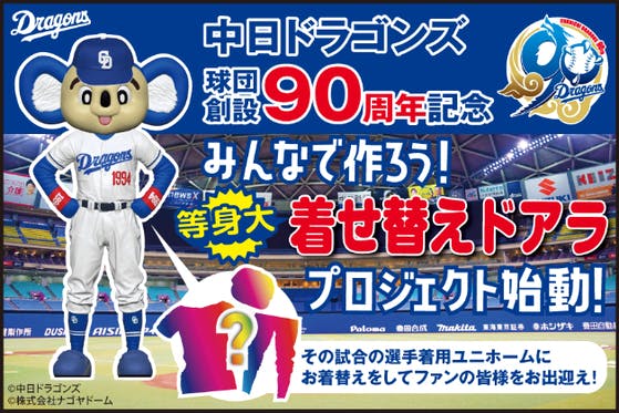 球団創設90周年のメモリアルイヤーをファンの皆様と盛り上げるためにプロジェクトを始動。その名も【みんなで作ろう!等身大「着せ替え」ドアラ】プロジェクト!その試合...