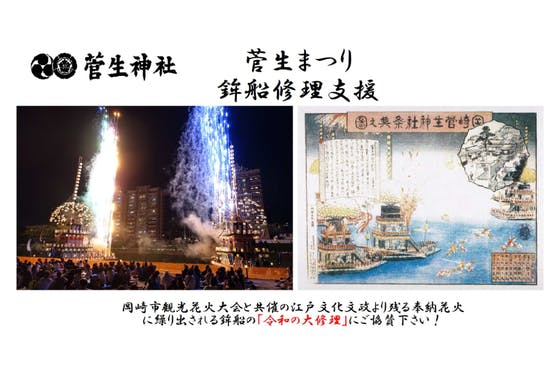 「岡崎三大祭」に数えられる「菅生まつり」で使用される鉾船の修理を行います。菅生まつりは、江戸の文化文政より残る奉納花火です。祭りの形式も時代とともに変化し、現在...