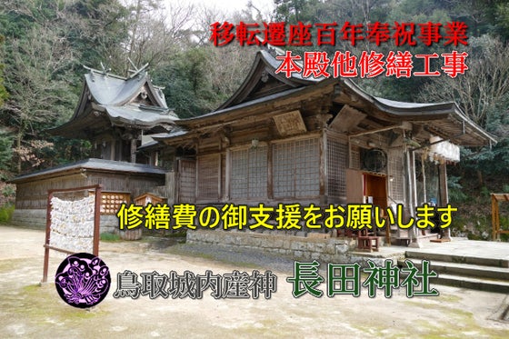 鳥取城産神 長田神社の移転遷座100年にあたり、遷座時に移築された本殿以下社殿(国登録有形文化財)の修繕工事を令和7年6月頃より行います。その修繕改修費が不足し...