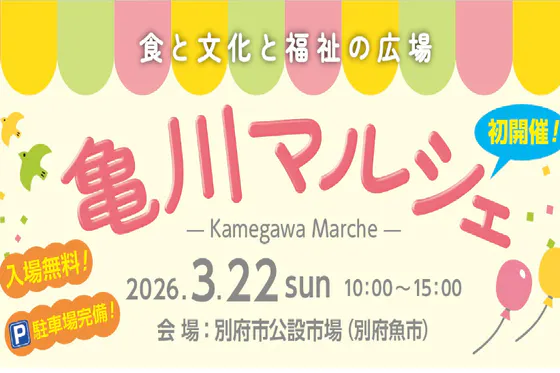 「亀川マルシェ」:2026年3月22日(日)、別府市公設地方卸売市場にて開催当日は、「食」「文化」「福祉」の3つのブースを設け、それぞれを同じ空間・同じ時間で体...
