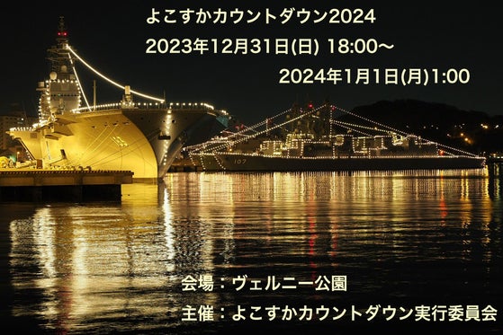 横須賀の大晦日・新年を彩るイベント「よこすかカウントダウン」。ヴェルニー公園を会場に、横須賀港に浮かぶ艦船イルミネーション、港の上に打ち上がる花火が特徴的なイベ...