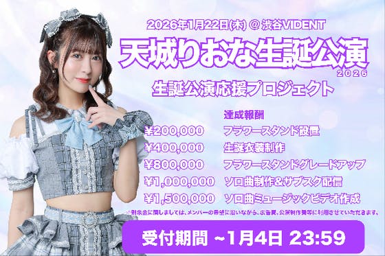 2026年1月22日に渋谷VIDENTで開催されるアイドルグループ『Cherie!』メンバーの天城りおな生誕公演の開催にあたって、衣装、スタフラ、舞台装飾、ソロ...