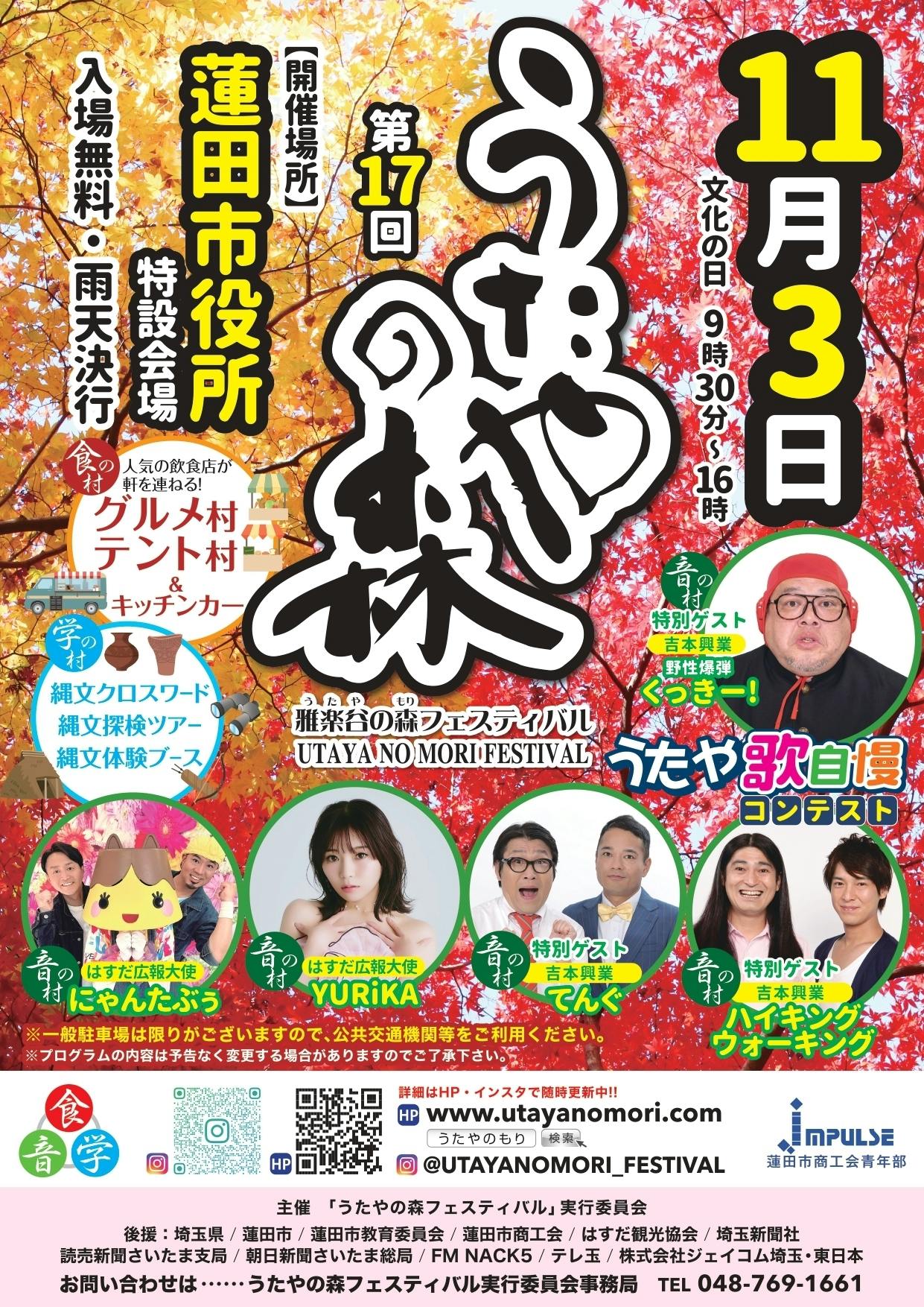 イベント内容 今年でうたやの森フェスティバルは17年目を迎えます。蓮田に100年続くお祭りとして、これまで来場者に楽しんで頂けるよう盛大に開催し、蓮田の秋の祭り「うたやの森フェスティバル」を広めてまいりました。 変化する時代の中で永続的な開催を目指すためには、昨年までの経験を活かしながら、新しいアイディア出し合うことが必要です。 行政、後援団体、協賛企業、地域のボランティア団体の協力をいただきながら、幅広い世代の来場者の皆様とうたやの森フェスティバルを盛り上げていきます。