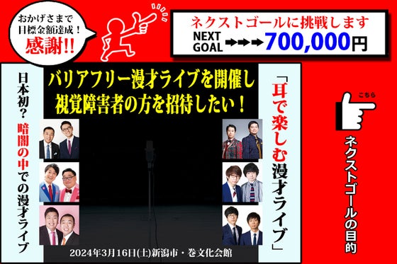 前半は通常の漫才ライブ、後半は舞台も客席も真っ暗にして暗闇の中で漫才を楽しむ、『耳で楽しむ漫才ライブ』を開催します。視覚障害者の方(および同伴者1名)をご招待し...
