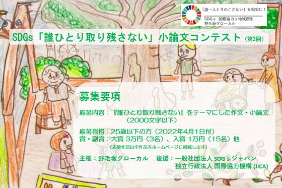 若者対象の作文・小論文コンテストを、SDGsの基本理念『誰一人取り残さない』の視点から10 月1日より実施します。このコンテストを通じて応募者は、『誰一人取り残...