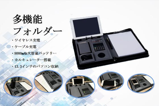 5in1フォルダー ワイヤレス充電、ケーブル充電、スタンド、カルキュレーター、PU材質のスタイリッシュデザイン、ビジネス用に最適