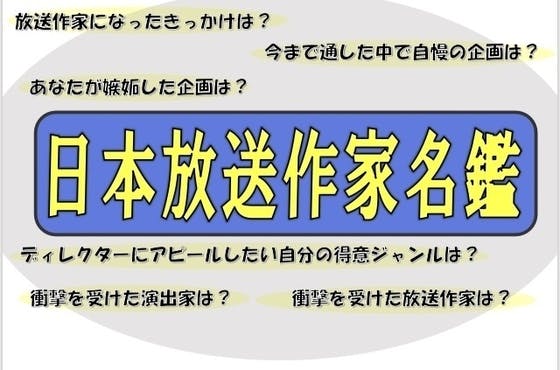 バラエティ制作に関わる放送作家を取材し「放送作家になったきっかけ」「これまで自分が通した中でベストの企画」「実は得意なジャンル」などを記載。一般のテレビ好きの方...