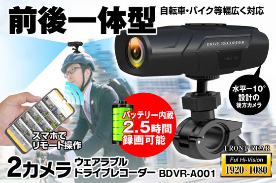 前方に加え、後方も同時に録画できる2カメラ一体型のドライブレコーダー。危険な“あおり運転”もしっかり記録できます。ヘルメットに取り付けたり、手持ちで撮影するアク...