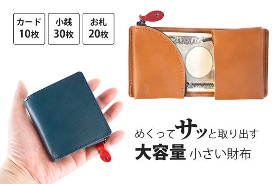 開くだけの二つ折り財布。「小さい」「大容量」「使いやすい」を実現。カード10枚の収納はめくるだけ。小銭入れは30枚。お札は20枚まで収納できます。ファスナーの引...