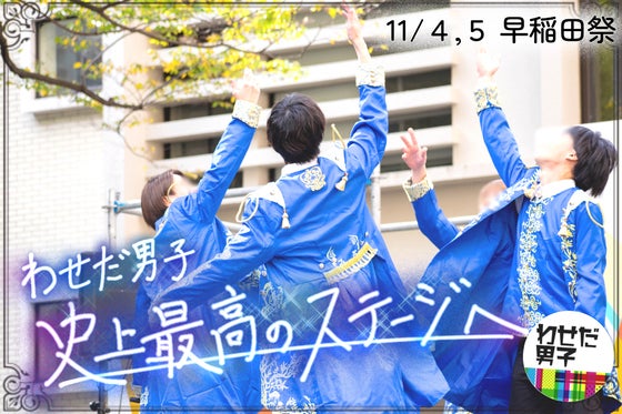 11月4日(土)5日(日)の二日間で早稲田祭が行われます。ここでわせだ男子は2つのステージに出演し、約2200人のお客さんを前にパフォーマンスを披露します。これ...