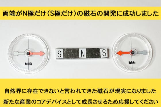 今まで実現ができないと言われていた両端がN極だけの磁石、両端がS極だけの磁石。私たちは特殊な着磁コイルを使ってそのような磁石を作ることに成功しました。両端がN極...
