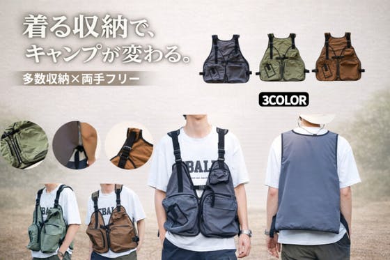 バッグを下ろさず必要な道具をすぐ取り出せる“着る収納”キャンプベスト。多収納ポケットと両手フリー設計で、設営や焚き火、調理をよりスムーズに。自然に馴染むアースカ...
