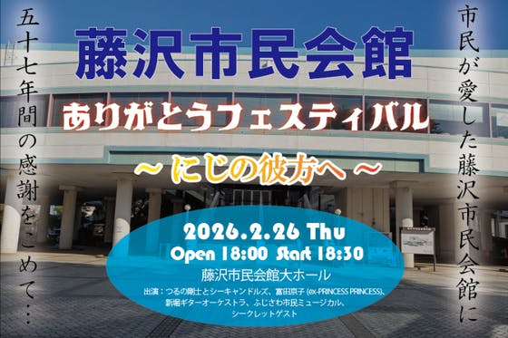 地域の方に多くの感動を届けてきた藤沢市民会館が、2026年3月をもって建て替えの為に休館します。 2/26(木)藤沢市民会館大ホールにて、富田京子さん、つるの...