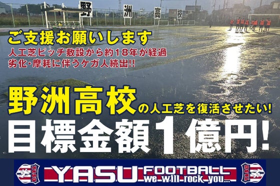 年々摩耗が激しくなっている野洲高校サッカー場の人工芝は、負傷者が頻繁に出る等安全面で危険な状態になっています。「子どもたちに整備されたピッチで思いっきりプレイし...