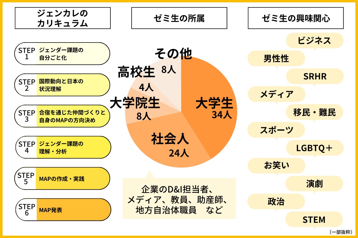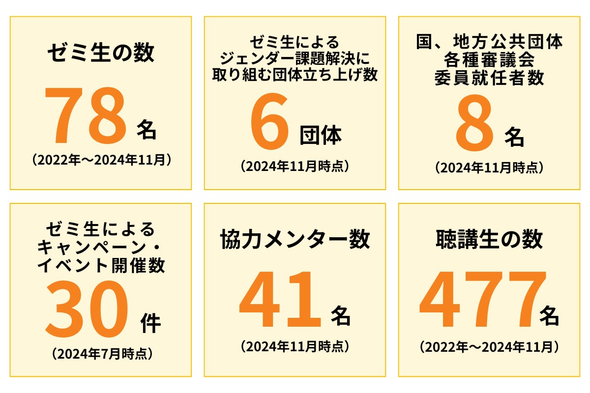 2022年の開始以来、ゼミ生と聴講生を合わせて総勢477名が参加しています。ジェンカレ修了後は、学校、企業、地域社会など多様な場でジェンダー平等の実現に向けた活動を行っています。