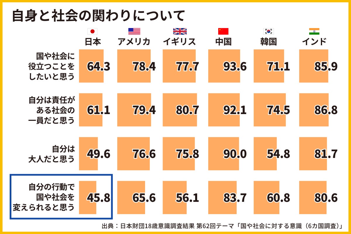 調査によれば、日本の若者たちはジェンダー平等に対する関心が高い一方で、「自分の声で社会を変えることができない」と感じている割合も高いことがわかっています。