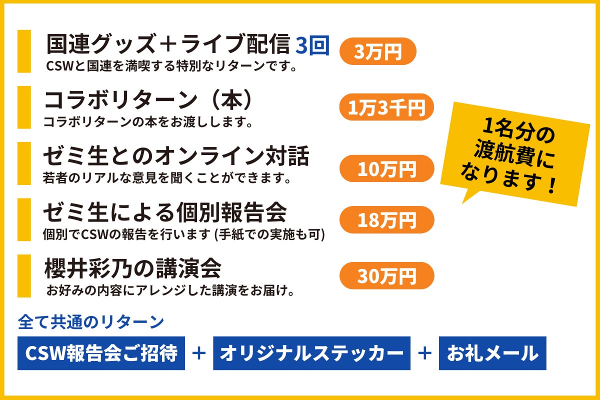 今回のクラウドファンディングでは、3000円から(学生のみ)ご支援いただけるようになっています。※リターンは順次追加していきます。