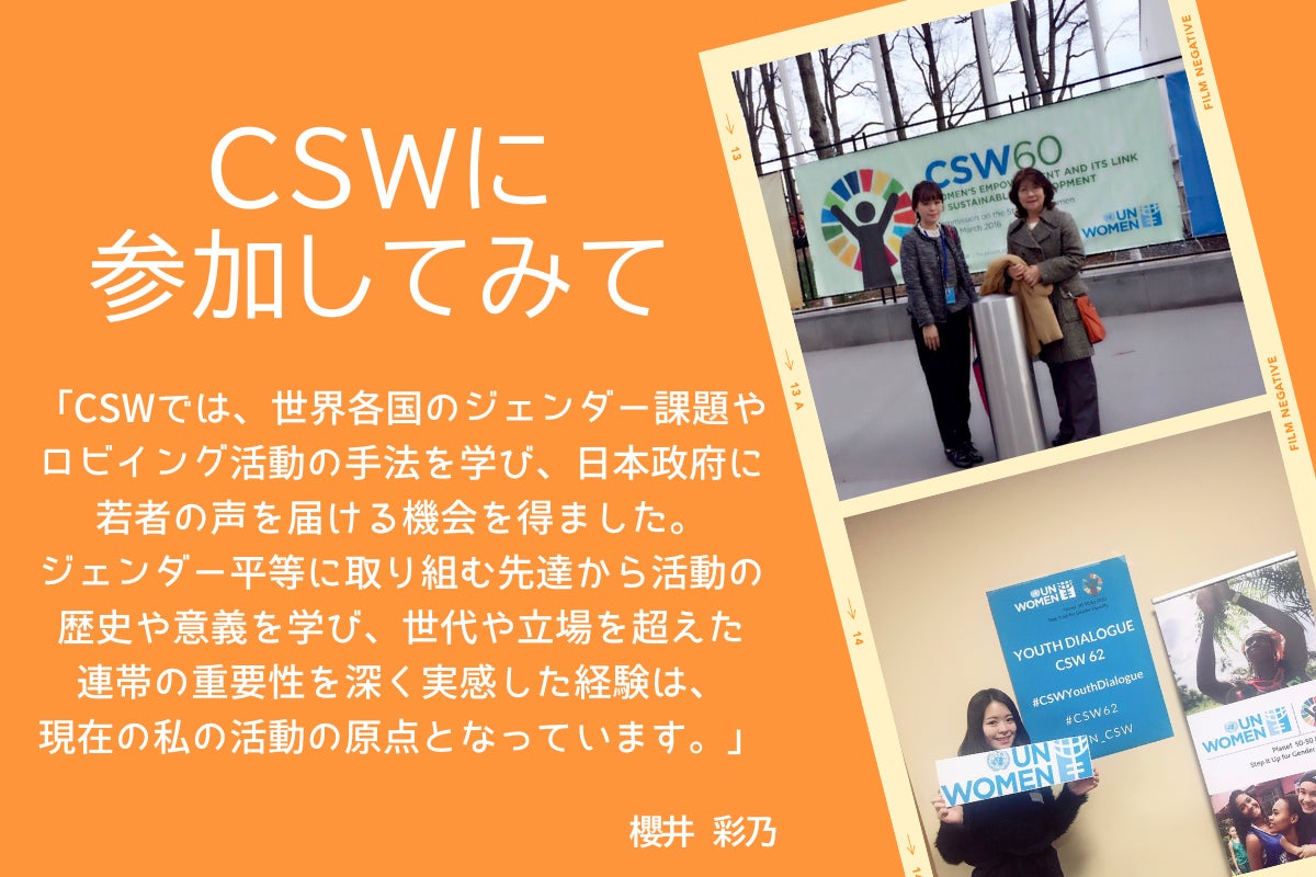 代表の櫻井彩乃は、大学生の時に一般社団法人大学女性協会から支援を受けてCSW60および62に参加しました。まさに、先達から育てていただき、次世代のジェンダー平等推進のバトンを受け取った一人です。
