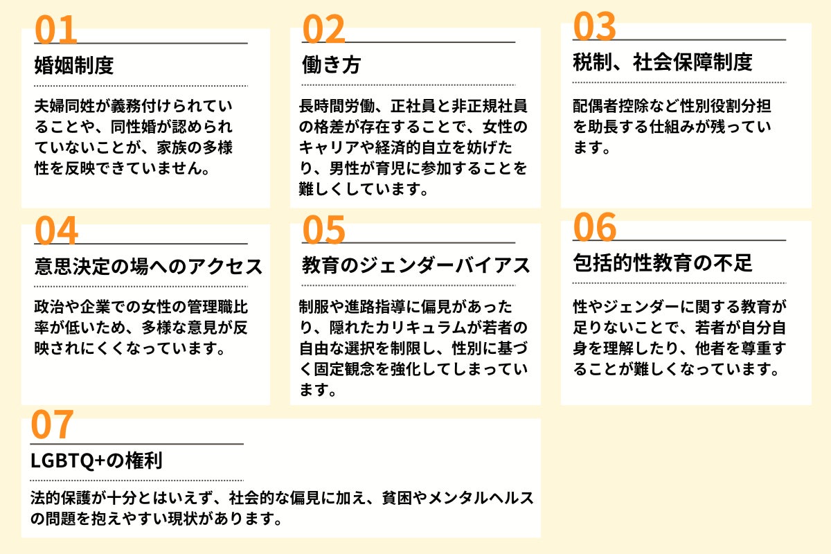 少しでも早く平等を達成するためには、ジェンダー不平等を生み出す制度や仕組みを変える必要がありますが、依然として以下のような問題があります。
