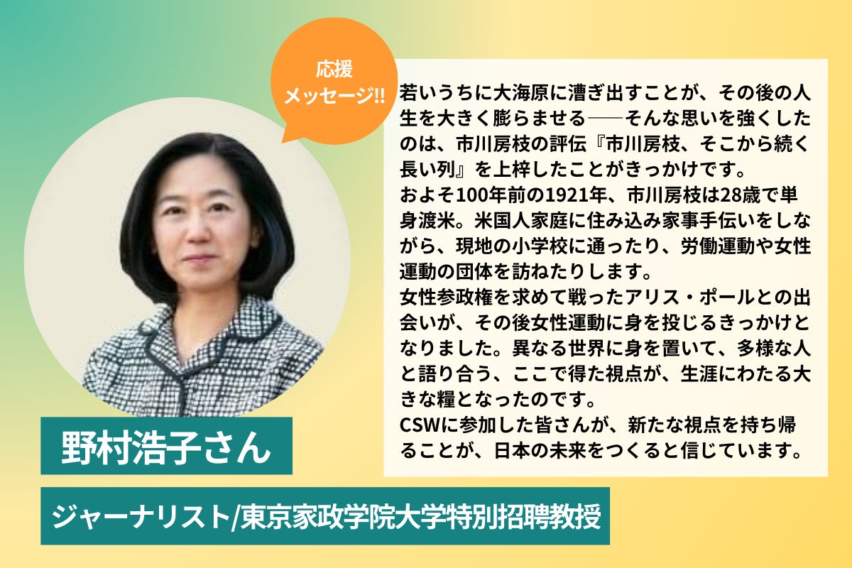 ジェンダー平等実現を目指し活動を続けてきた先達と共に、国際行政とNGOが交差し議論する最も重要な時間に立ち会えた経験は今も私の原点にあります。だからこそ、次は「若者を応援する側」から、次世代の若者たちにも、同じように世界を広げ、行動する力を得てほしいと願っています。ジェンカレを通じた机上での学びを、社会での課題解決の実践につなげてきたジェンカレゼミ生は、CSWの熱気を体感しながら、多くを学びつつ、日本のジェンダー平等を前に進めるため、国際会議の場に日本の若者の声を必ず届けることができます。応援をよろしくお願い申し上げます。
