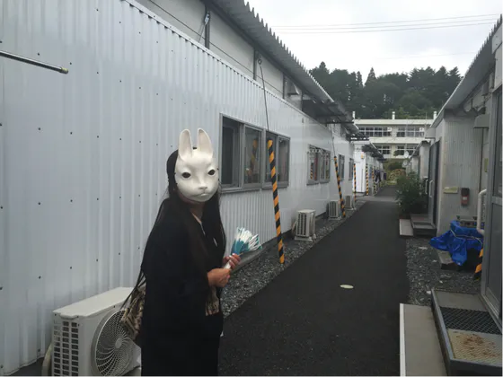 キツネ面の眼球にカメラを装着し、参加者の持つスマートフォンに目線映像を配信、それを頼りにキツネを探す。遊びながら津波からの避難経路を学べる少し不思議な参加型アート!2002年から日本・中国・ドイツで展開してきたアートプロジェクトです。