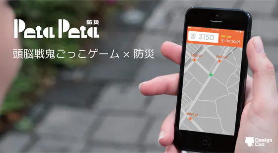 「Peta Peta」は、株式会社DesignCat と首都大学東京渡邉英徳研究室で開発した、 スマートフォンアプリと中敷き型デバイスを使った新感覚のおにごっこ。 株式会社DesignCat は、Peta Peta を地域に合わせてアレンジすることで、 地域の課題を解決するエンターテイメントコンテンツを提案している。 「Peta Peta × 防災」は、街を良く観察して街の特徴を把握したり、 危険箇所を見つけたり、ゲームへの参加を通して防災を楽しむゲーム。