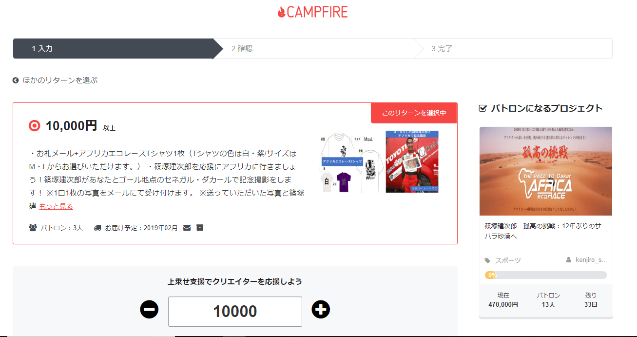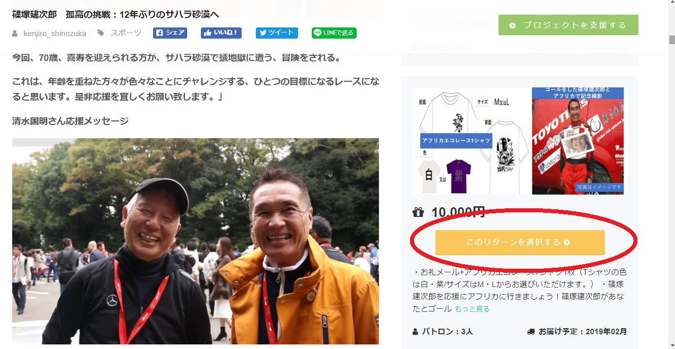 ①クラウドファンディング 篠塚建次郎アフリカエコレースプロジェクトのページより、支援したいリターンを選び、オレンジの「このリターンを選択する」というボタンをクリック。