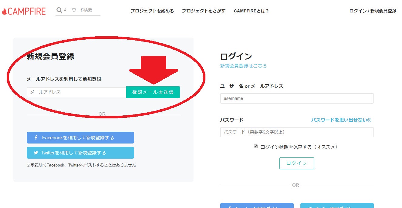 ② 新規会員登録欄にメールアドレスを入力して、「確認メールを送信」ボタンを押す。