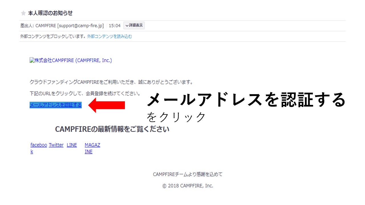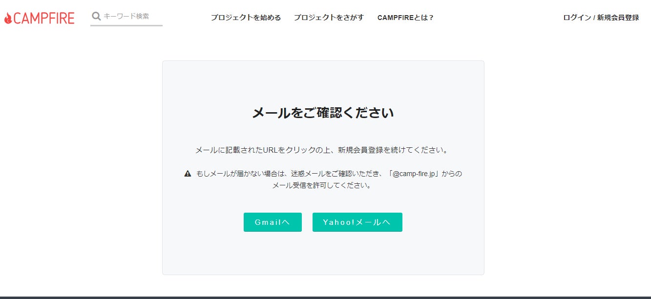 ③ 「メールをご確認ください」という画面がでるので、入力したメールアドレスのメールボックスを確認する。CAMPFIREより「本人確認のお知らせ」というメールが届いています。