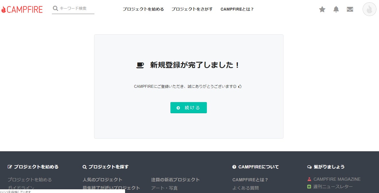⑥ 新規登録が完了しました!という画面が出るので「続ける」をクリック。