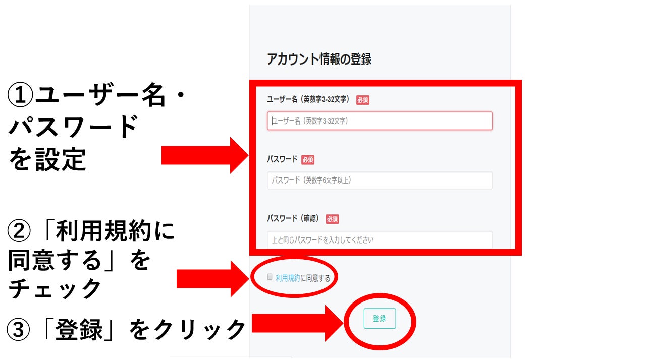 ⑤ 「メールアドレスを認証する」をクリックと、アカウント情報の登録という画面が表示されます。ユーザー名、パスワードを設定し、「利用規約に同意する」をチェック、「登録」をクリック。